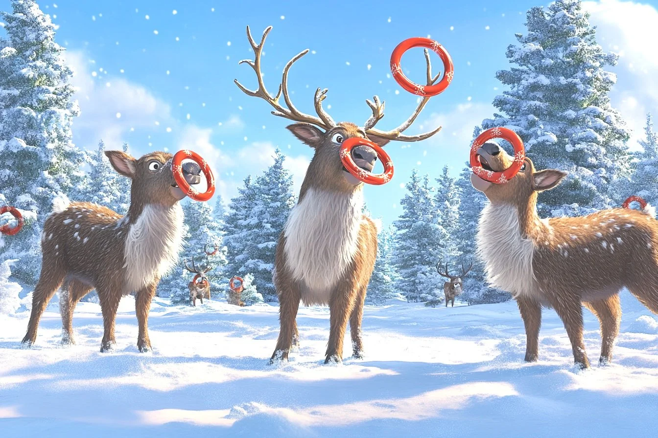 Here at the North Pole, we know that teamwork makes the magic happen, and that’s true for everyone, even the reindeer! While they’re experts at pulling the sleigh and navigating through the night sky, it’s important to keep their spirits high and their bond strong. That’s why Cupid has taken the reins (pun intended) to organize a special reindeer game night, and let me tell you, it’s going to be a night full of fun, laughter, and a little friendly competition! On the agenda are some classic North Pole games with a festive twist, starting with a crowd favourite: ‘Pin the Red Nose on Rudolph.’ It’s exactly what it sounds like a reindeer-friendly version of the traditional party game. The reindeer take turns being blindfolded, spun around, and then try to pin a bright red nose on a picture of Rudolph. It’s not as easy as it sounds, especially when you’re a little dizzy from the spin! The laughs are endless as noses end up on antlers, ears, and even tails.